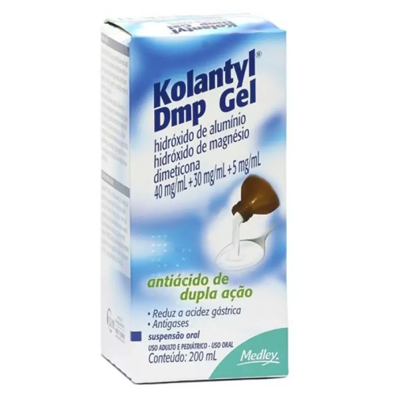 | Principal indicação | KOLANTYL DMP Gel é um medicamento com atividade antiácida, contendo um componente antiflatulento, indicado para o alívio sintomático da acidez estomacal, azia (queimação) e má digestão, associadas ao diagnóstico de úlcera péptica (estômago ? duodeno), refluxo (retorno do conteúdo gástrico ao esôfago), gastrite (inflamação do estômago), esofagite péptica (inflamação do esôfago) e hérnia de hiato (fraqueza do músculo que divide o abdome do tórax e por esse motivo permite o retorno do conteúdo do estômago para o esôfago) e sintomas consequentes ao excesso de gases no aparelho gastrintestinal. |